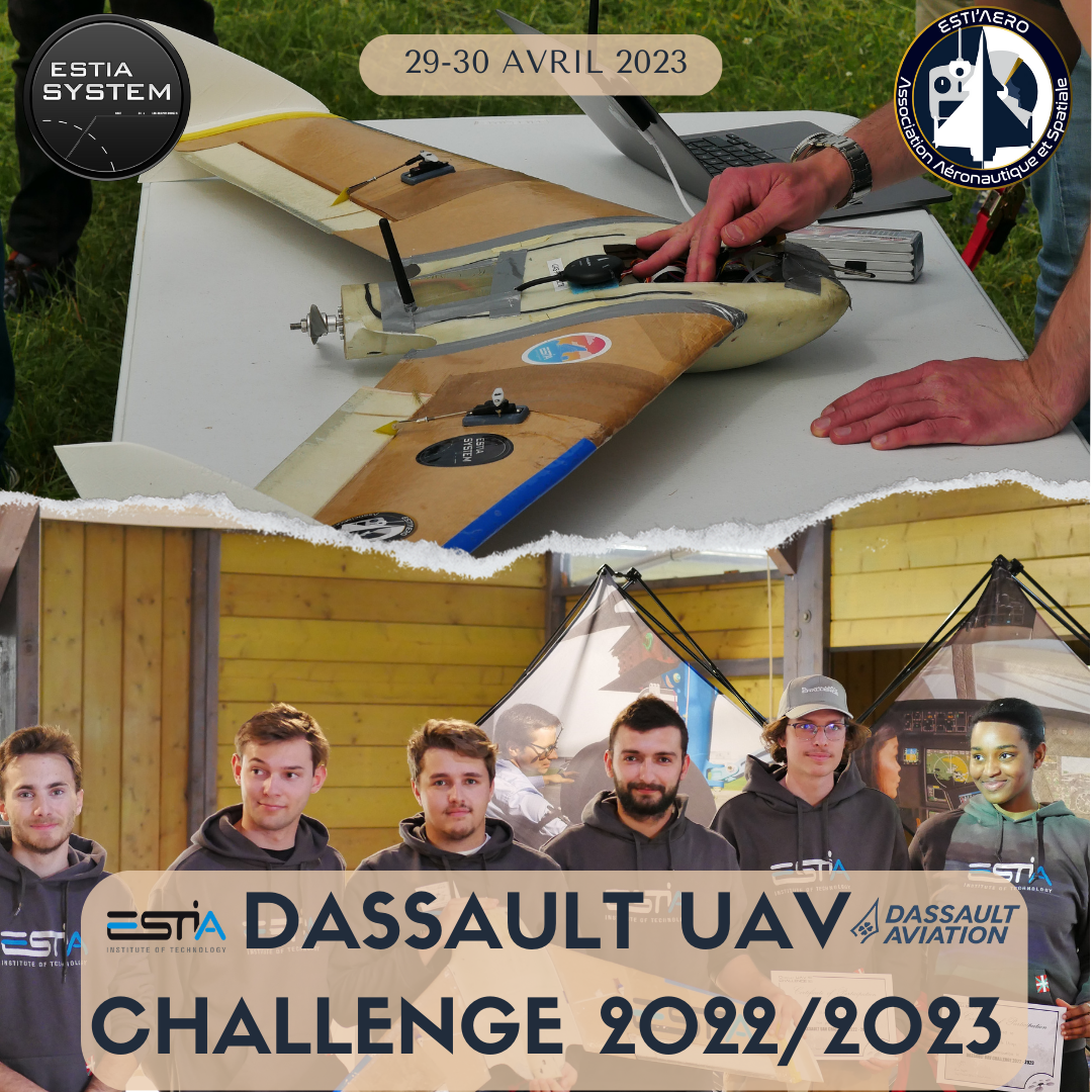 Le weekend du 29-30 avril 2023 a eu lieu l'édition 2023 du Dassault UAV Challenge. L'équipe ESTI'UAV a présenté une aile volante autonome pour du largage de couvert végétal. Projet réalisé en partenariat entre ESTI'Aero et ESTIA SYSTEM, l'équipe a terminé à une belle 4ème place.